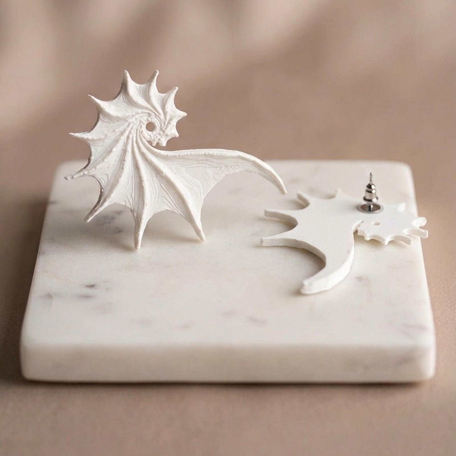 O pereche de cercei statement, realizați prin printare 3D și finisați manual, cu un design inspirat din formele naturale ale mării. Dimensiunea generoasă îi transformă într-un element central al ținutei, fără a deveni grei sau incomozi.
